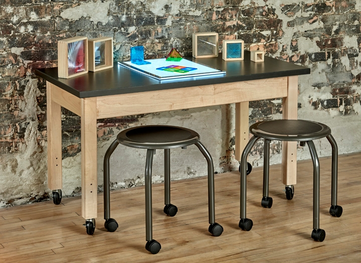 Mobile Science Table - Solid Table with Black Chem Guard top for Science and Messy Discovery. Solid maple 4” maple apron with 27”H fixed height Legs -Earth-friendly UV finish. 4 - Locking 2” casters gives mobility to your Science area. Partner with Metal or wood Stools at 16” Height . Dimensions: 48” W x 24”D x 27” leg height. Made in the USA. This item ships by truck .