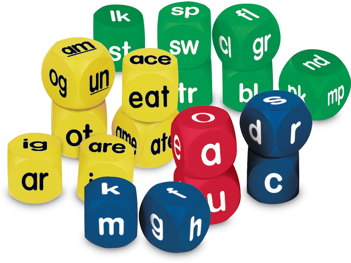Set of 18 includes lower case alphabet cubes 2 red vowels and 4 blue consonant yellow word families cubs 3 of each two and three letter word families and green blends cubes 4 beginning blends and 2 ending blends.