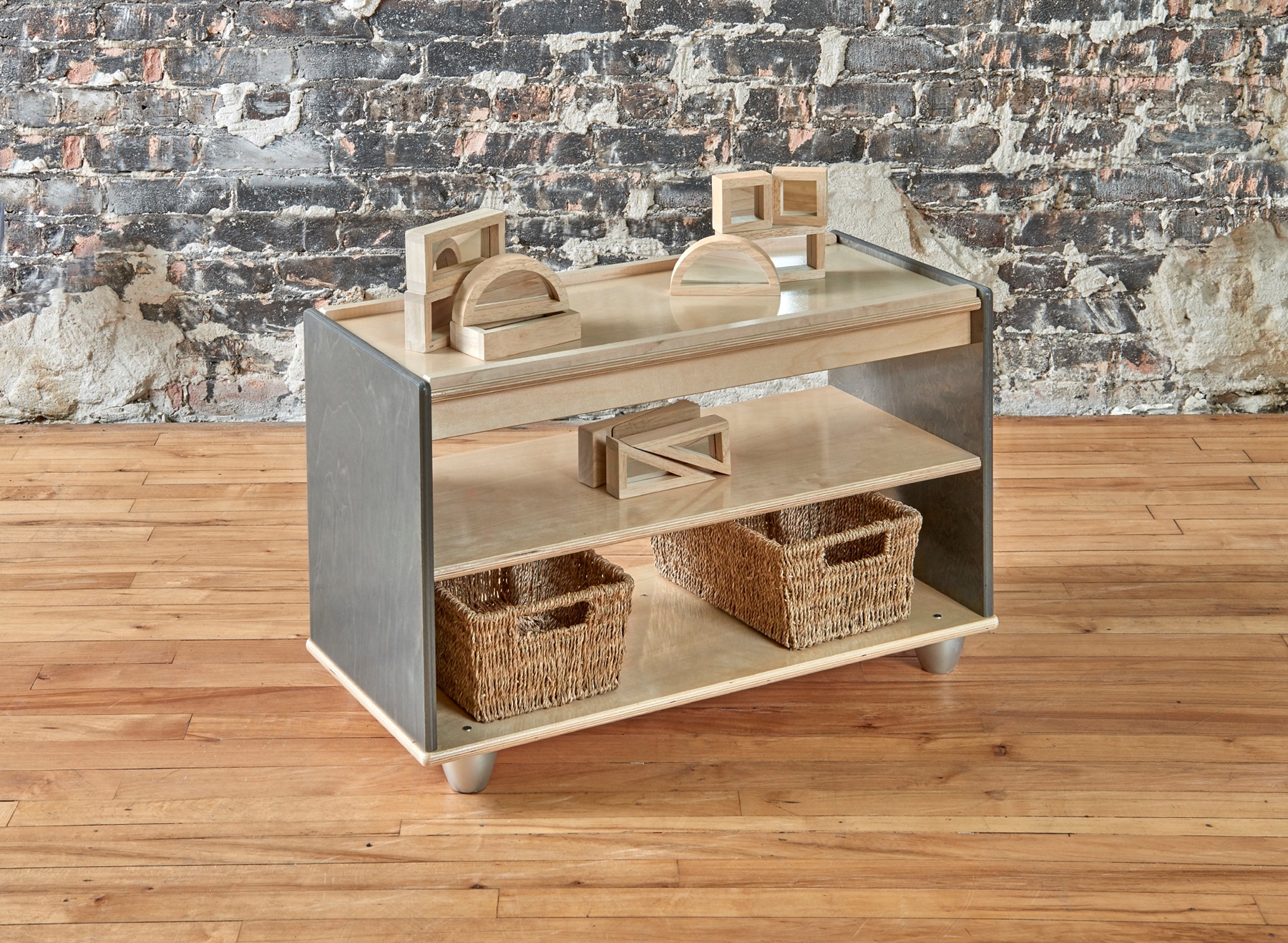 Modern Collection Gray wood stain on side panels accents the natural wood grain of this space-saving, 30"-wide storage unit. Open toddler shelf allows for display at 19" toddler height. Brushed silver metal feet and two-tone wood updates your environment. Dimensions: 19" H x 30" W x 14 1/2" D.