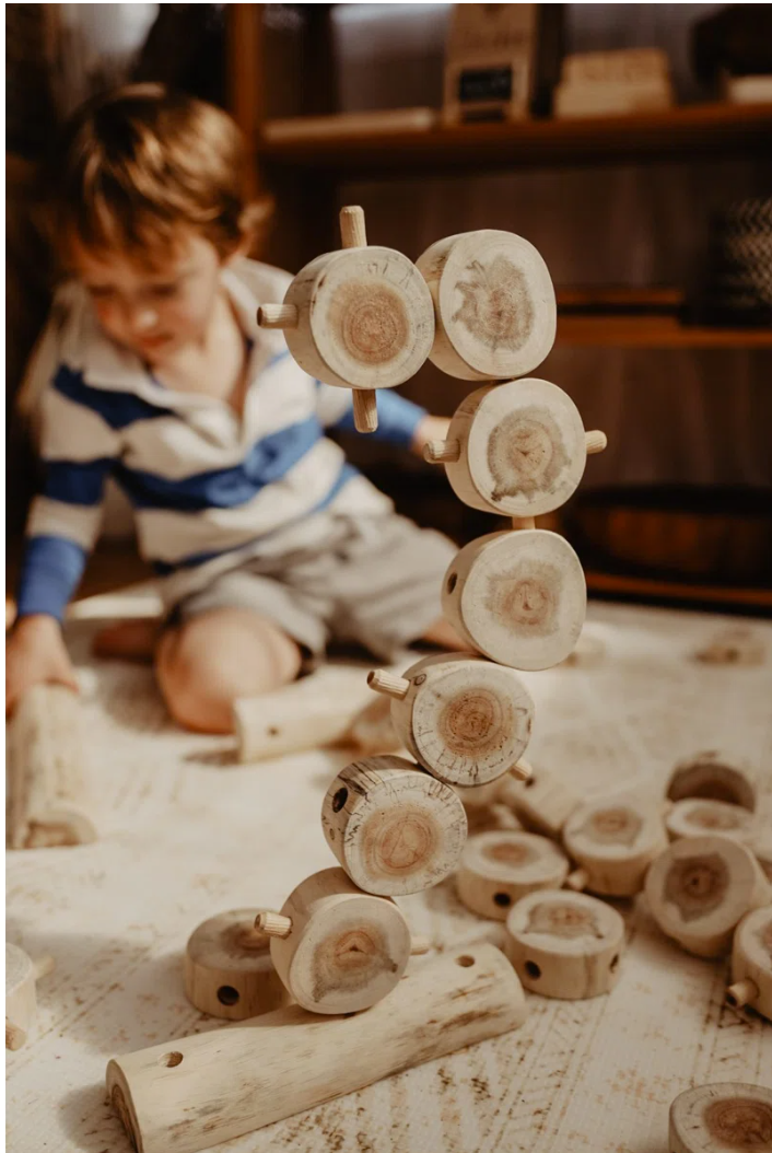Contains 40 pcs natural wooden tree pieces. Great for open ended play and building, improves visual perception and exercises memory. Enables creativity and the ability to solve